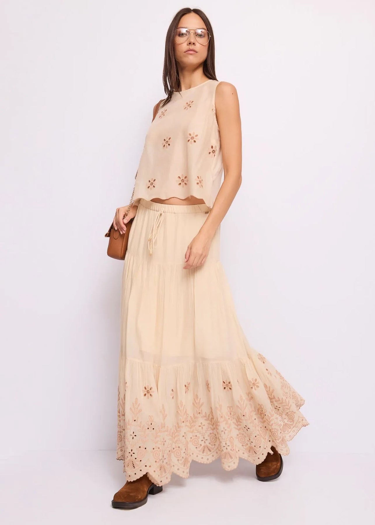 Scegli la gonna lunga in voile di misto cotone con pieghe, ricami floreali e coulisse in vita. Per un look fresco e rilassato dal fascino boho-chic.