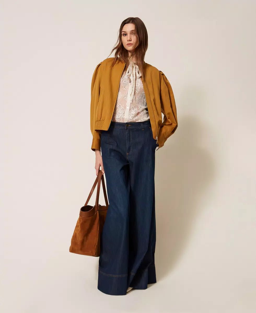 Jeans in cotone stretch con lavaggio scuro leggermente schiarito. Ha passanti in vita, chiusura con zip e bottone, tasche alla francese ai fianchi, fondo alto impunturato, linea a palazzo.