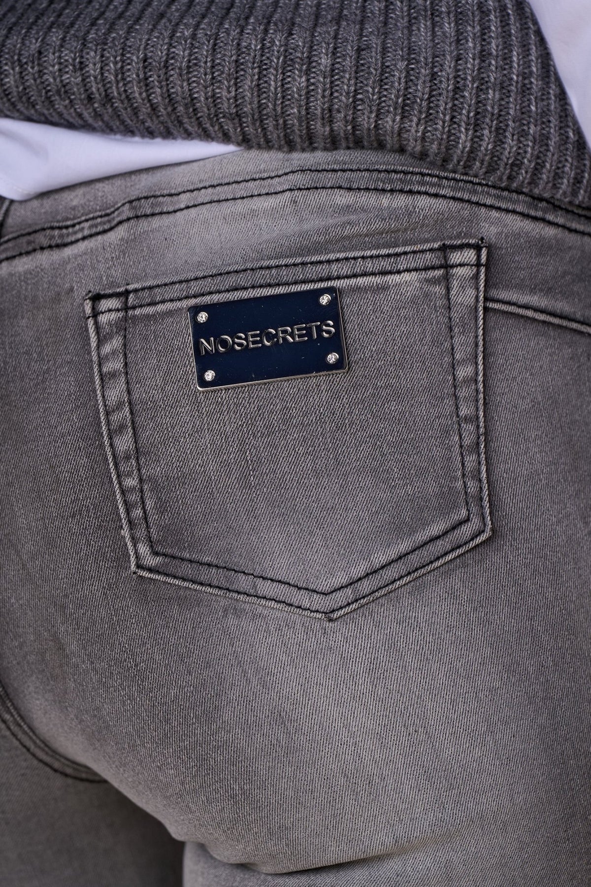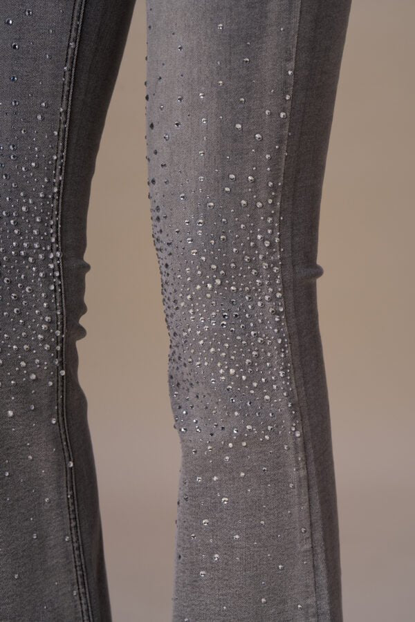 Nosecrets Milano Jeans grigio chiaro modello a zampa con strass e taglio vivo sul fondo.