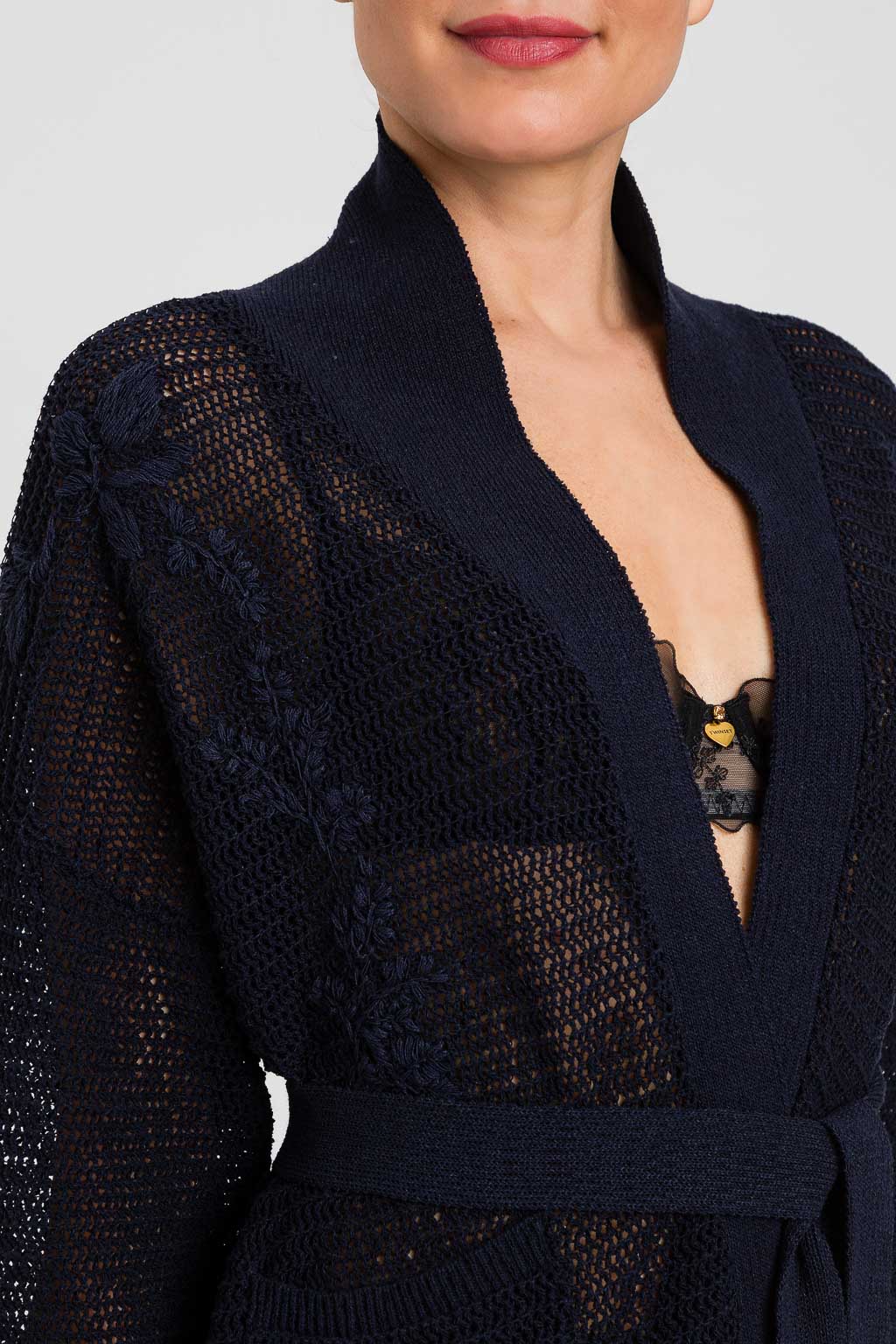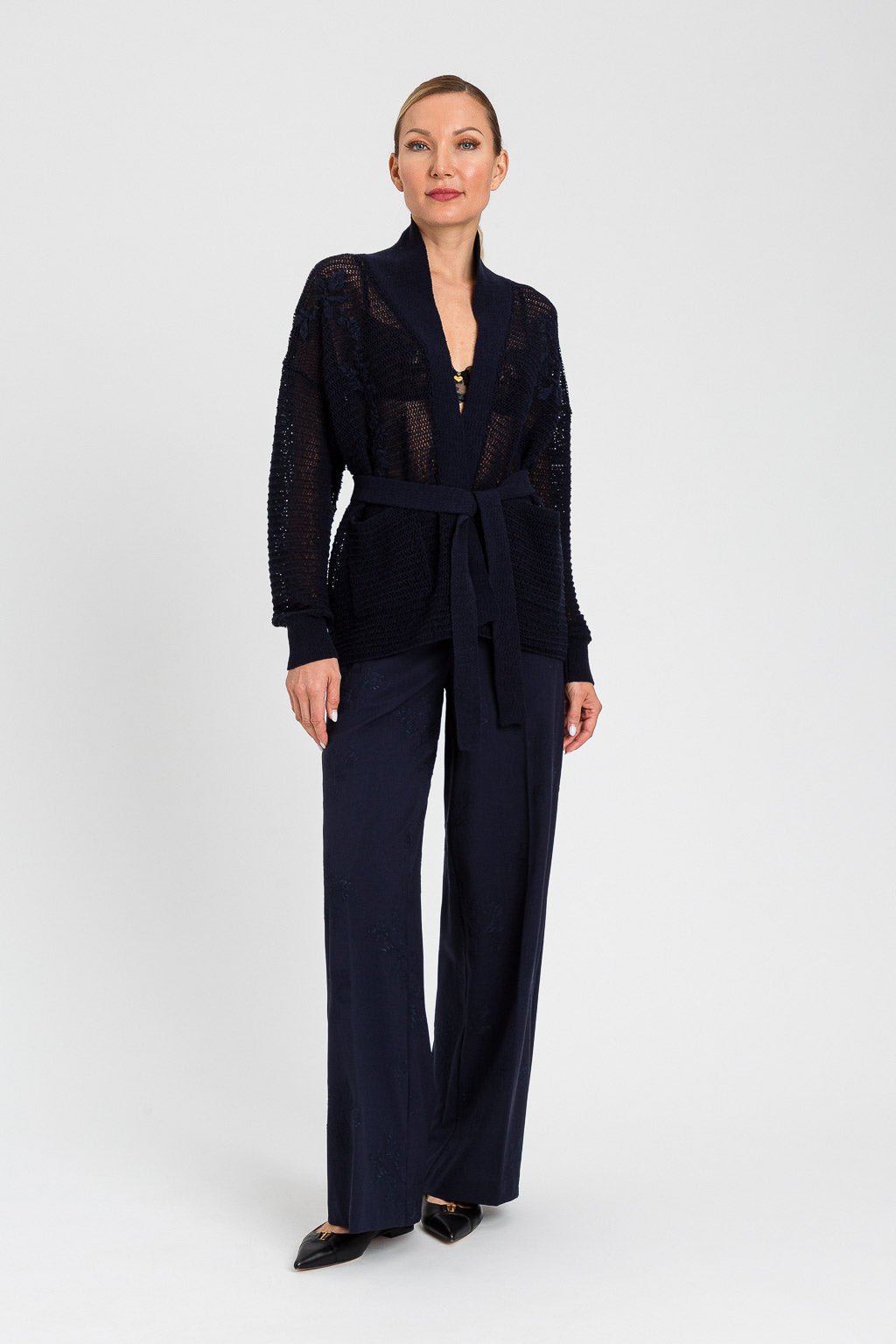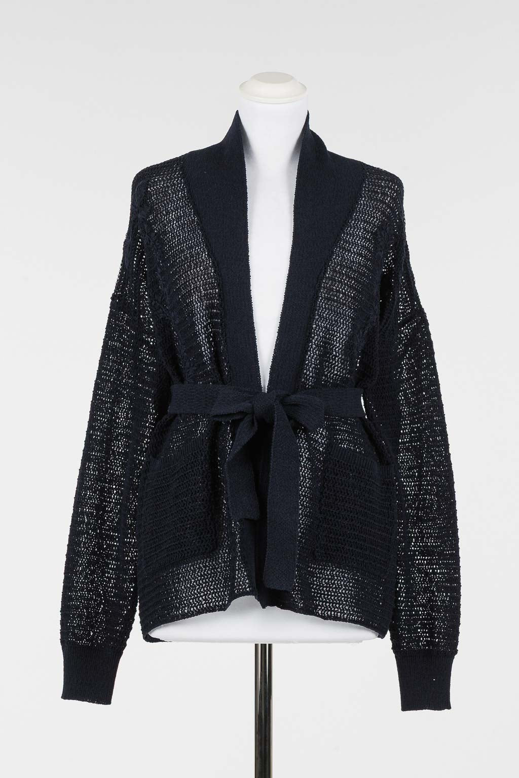 Twinset Cardigan blu in cotone lavorazione a rete con tasche e cintura.