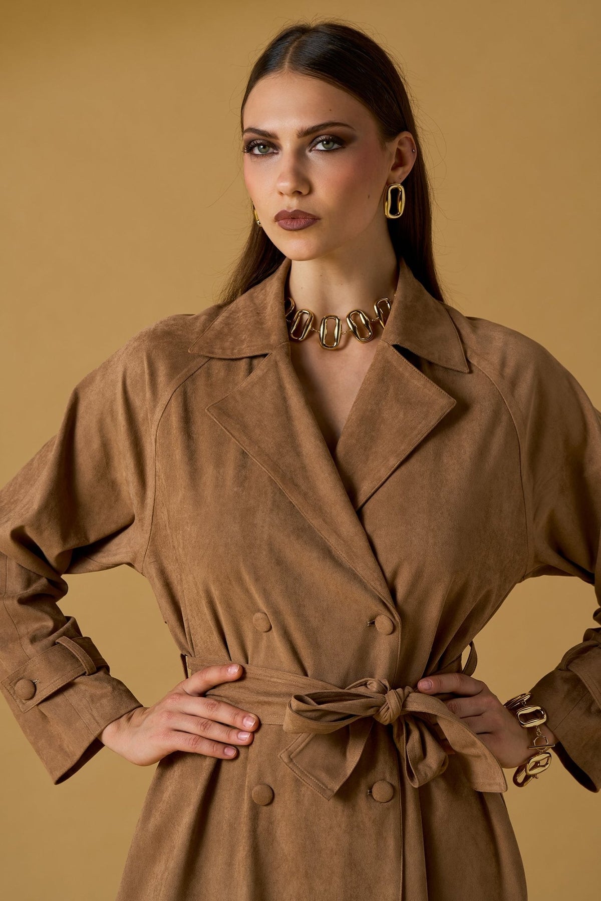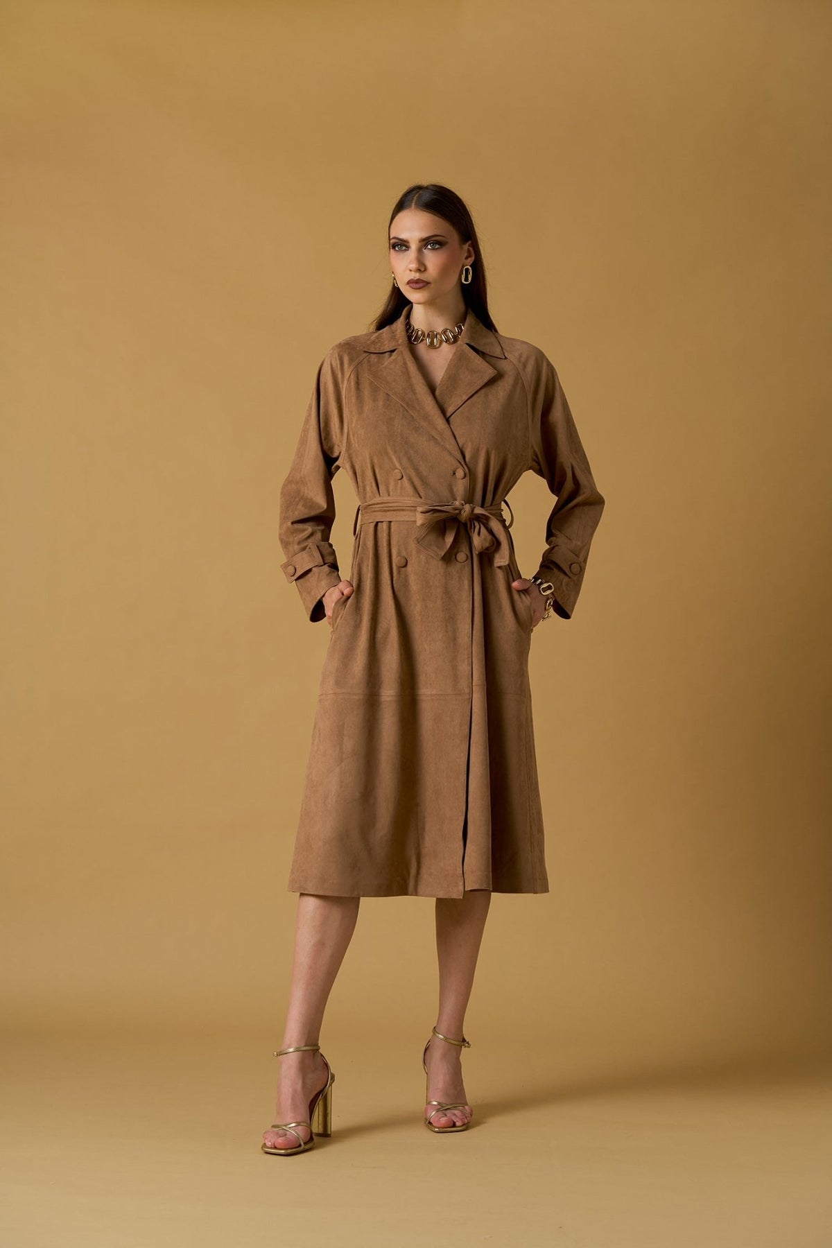Trench elegante in morbido scamosciato, perfetto per uno stile sofisticato e versatile. La cintura in vita definisce la silhouette, mentre il tessuto di qualità garantisce comfort e durabilità. Ideale per creare look raffinati sia in ufficio che nel tempo libero. Un capo essenziale che non passa mai di moda, facile da abbinare con qualsiasi guardaroba.
