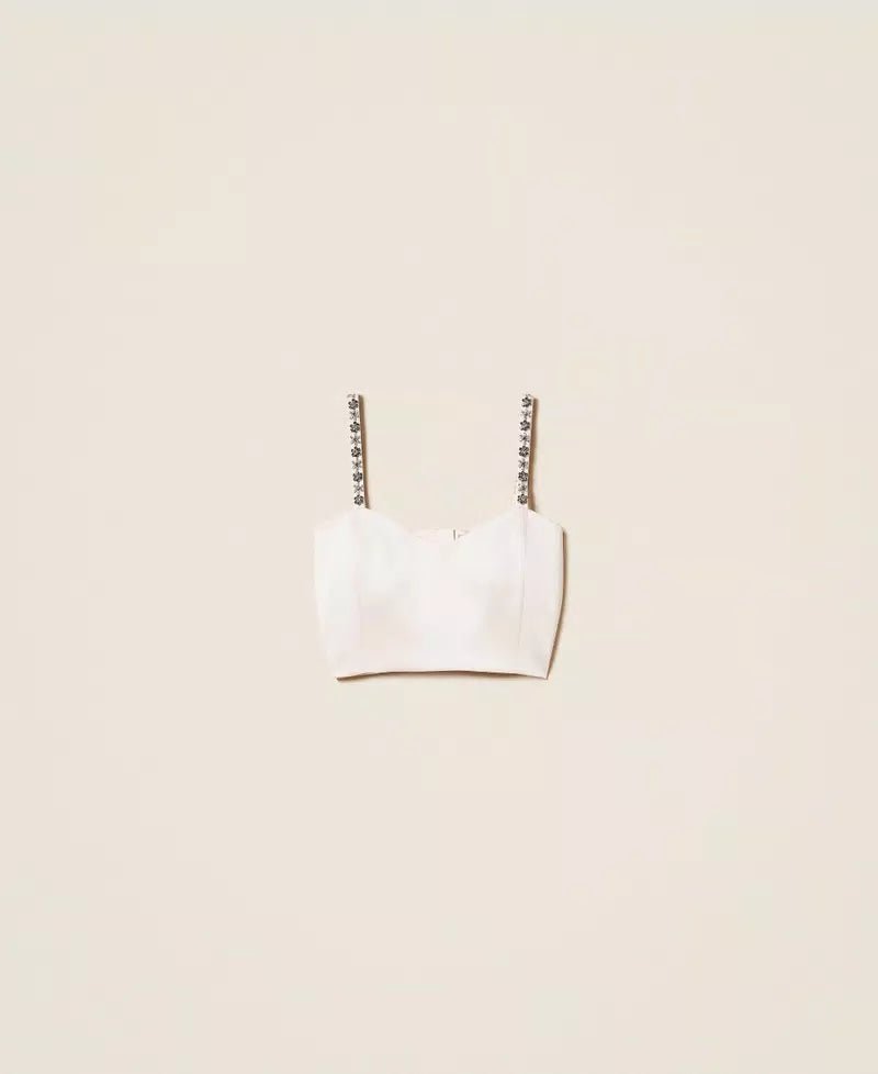 Twinset Top cropped in duchesse con spalline sottili ricamate da castoni. Ha chiusura con zip sul retro, fodera e linea fitted. Perfetto per party e cerimonie.