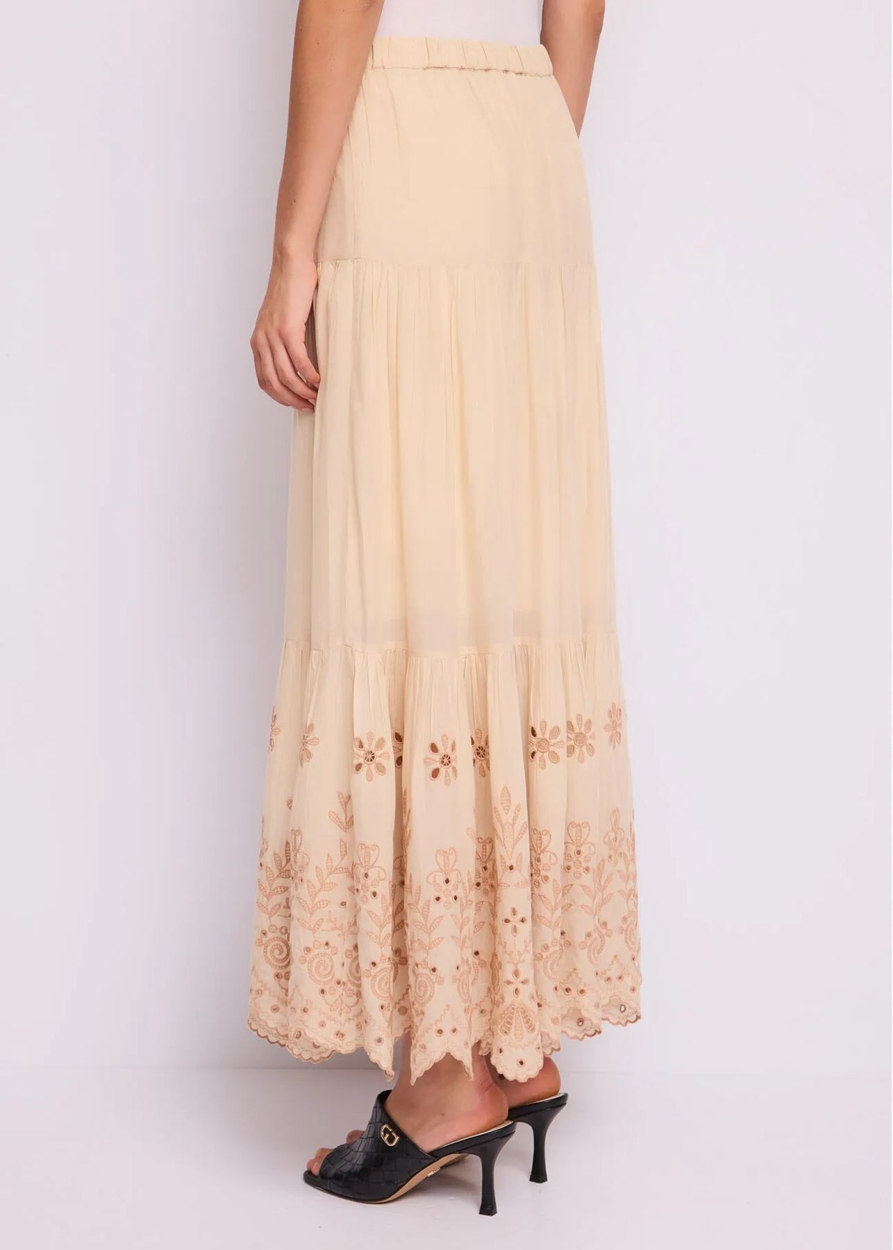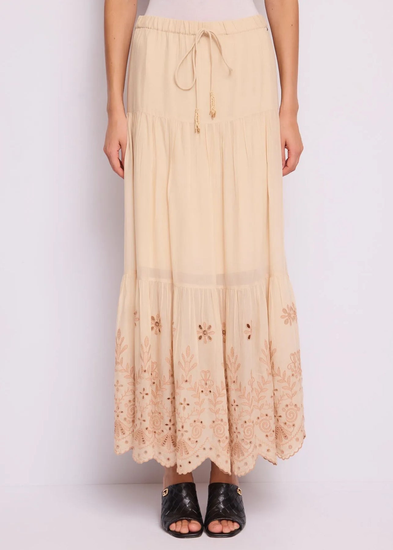 Scegli la gonna lunga in voile di misto cotone con pieghe, ricami floreali e coulisse in vita. Per un look fresco e rilassato dal fascino boho-chic.