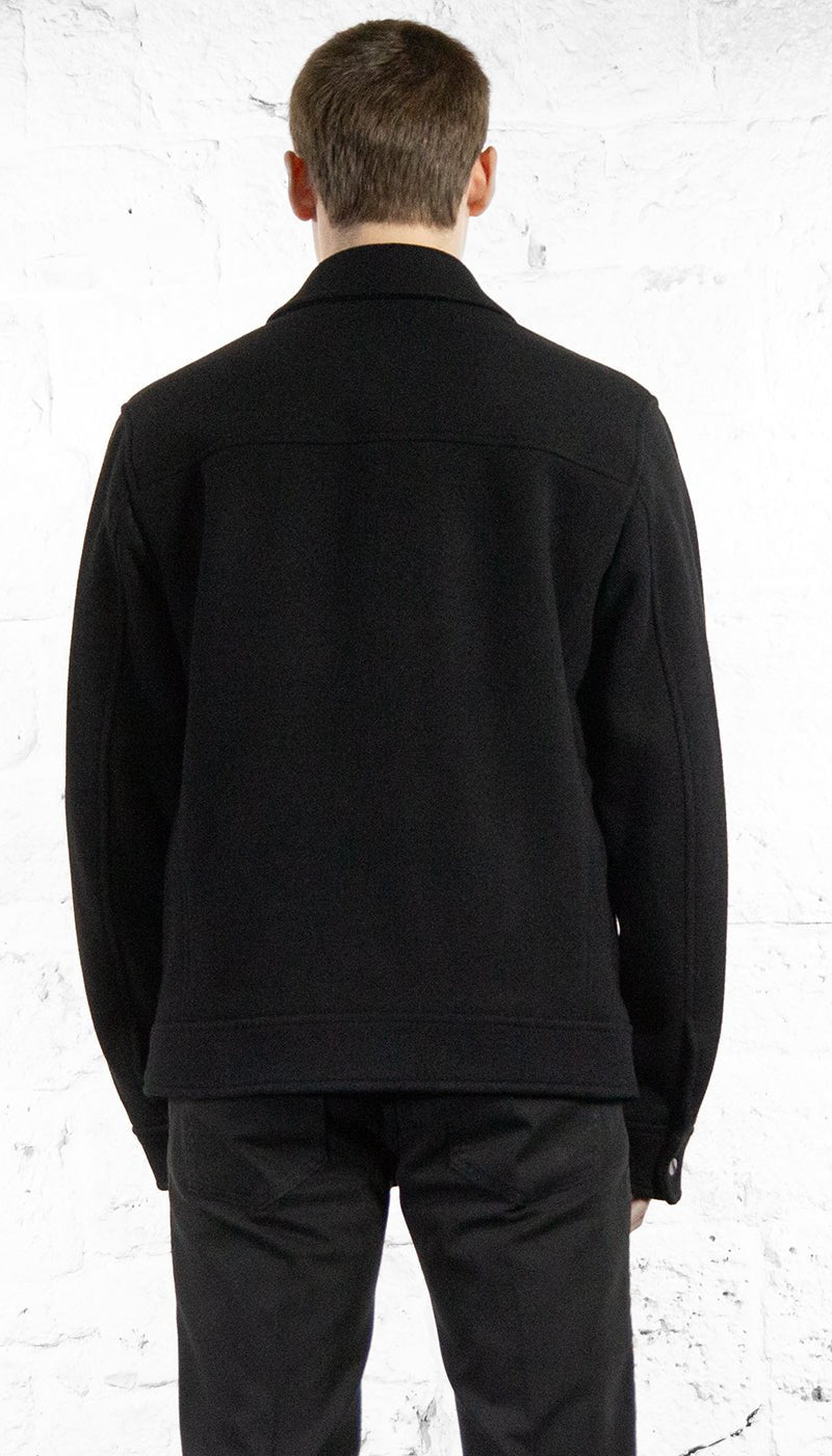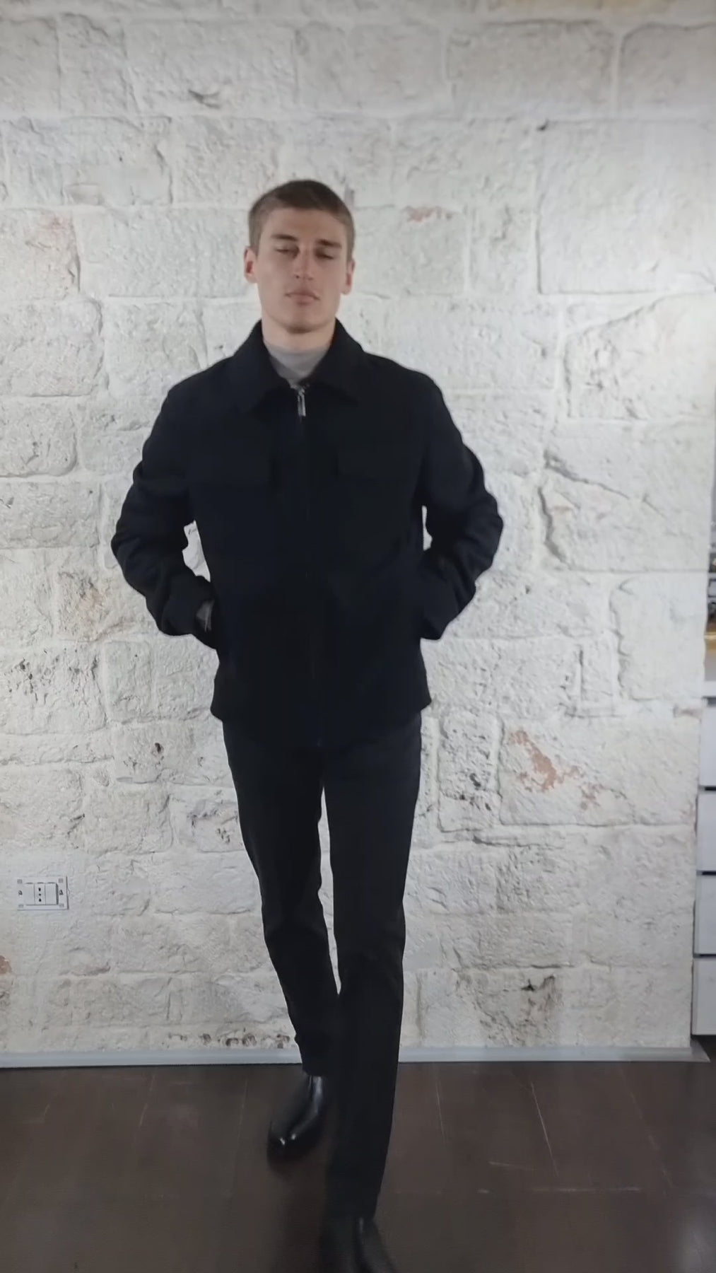 Giubbino foderato collo camicia, chiusura con zip, due tasche ai fianchi e due a toppa con pattina frontali, bottoni ai polsi, finiture con impunture. Panno in misto lana