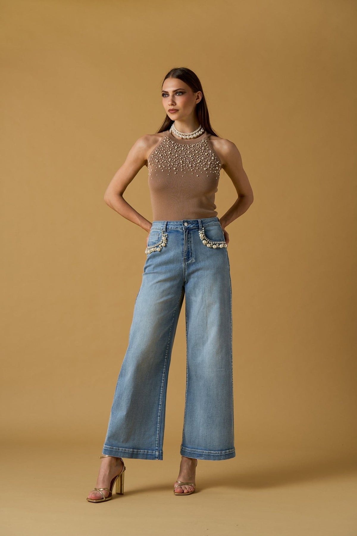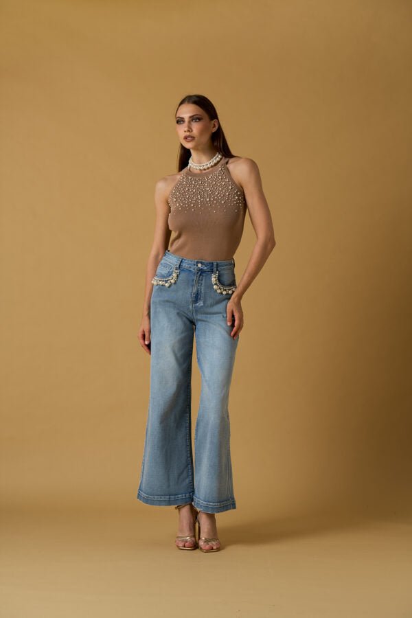 Nosecrets Milano Maglia in viscosa smanicata scollo americano con perle.