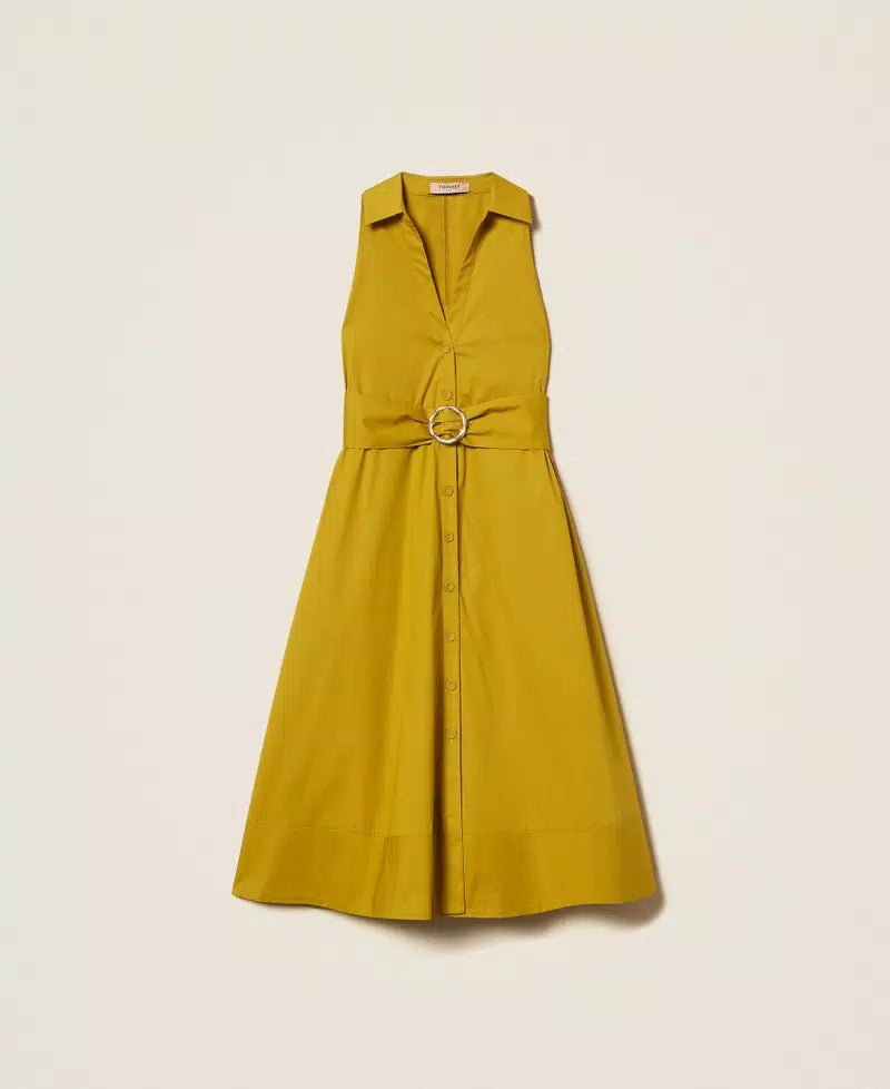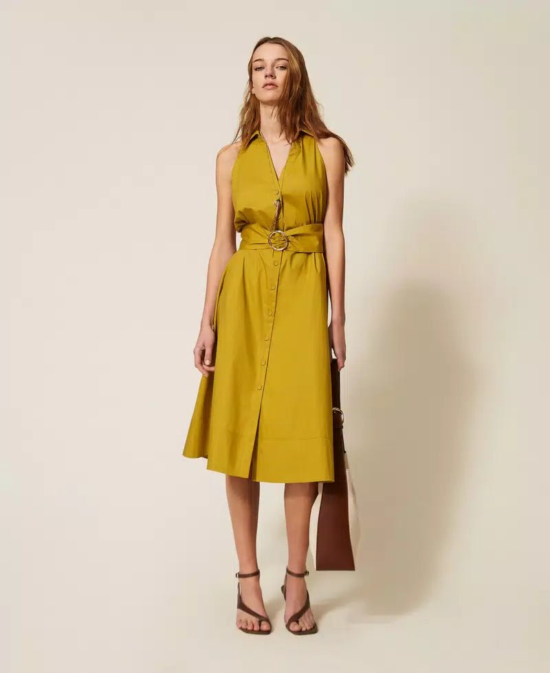 Abito longuette in popeline di cotone stretch con revers, scollatura a V, chiusura con bottoni in tono, cintura rimovibile con fibbia in metallo, linea ampia.