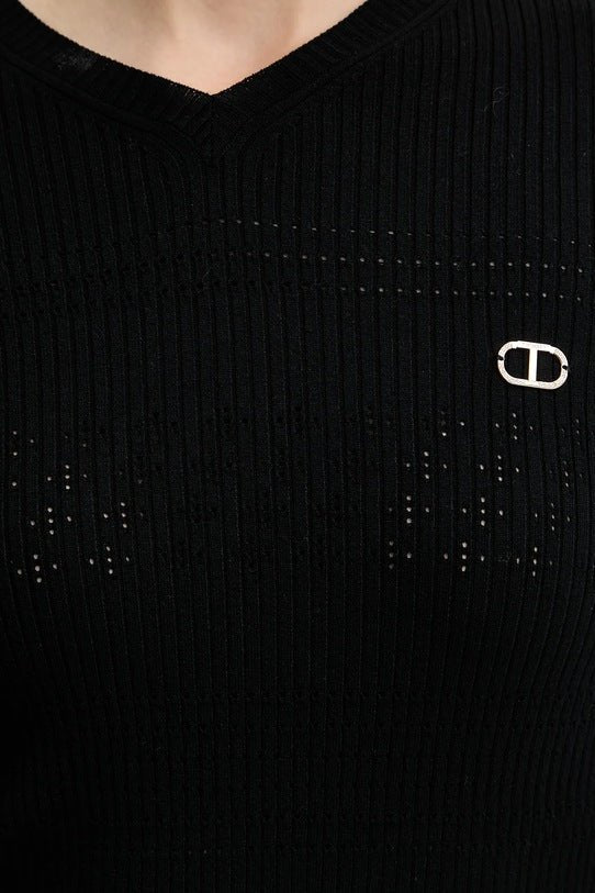 Twinset Maglione nero vestibilità aderente, scollo a v a costine in viscosa.
