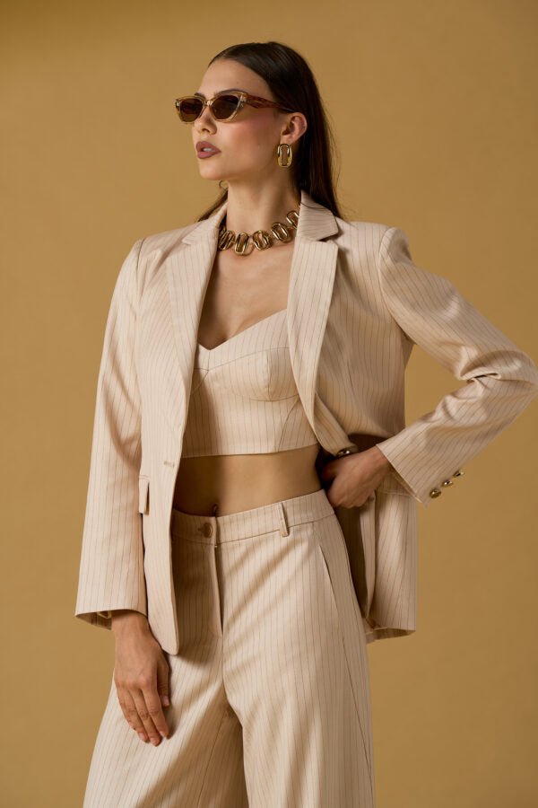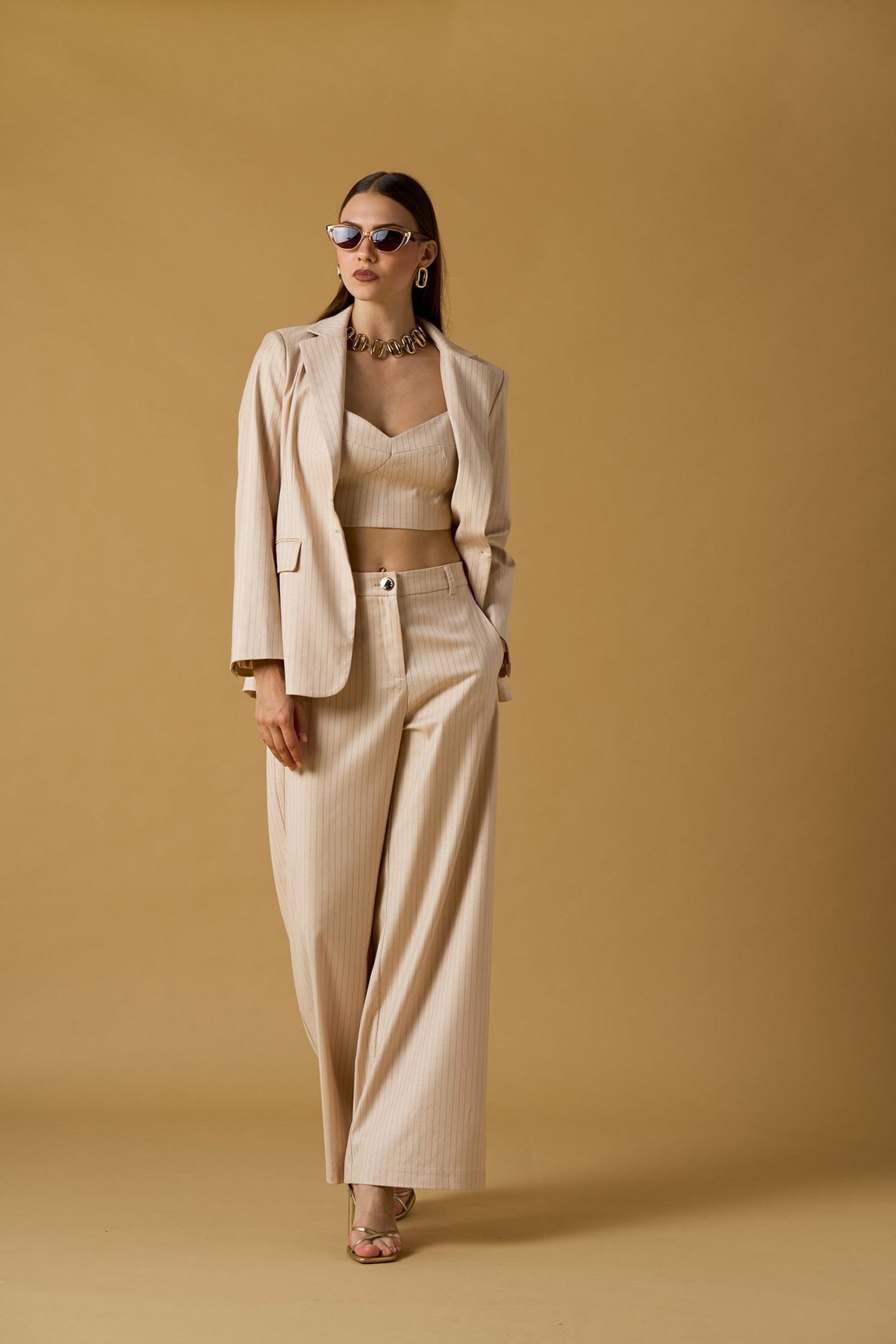 Pantalone Nosecrets Milano modello palazzo gessato oro in tessuto.