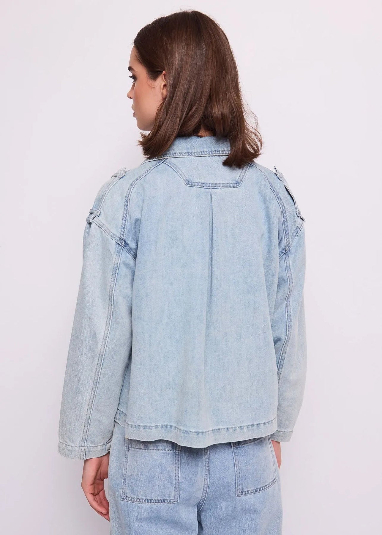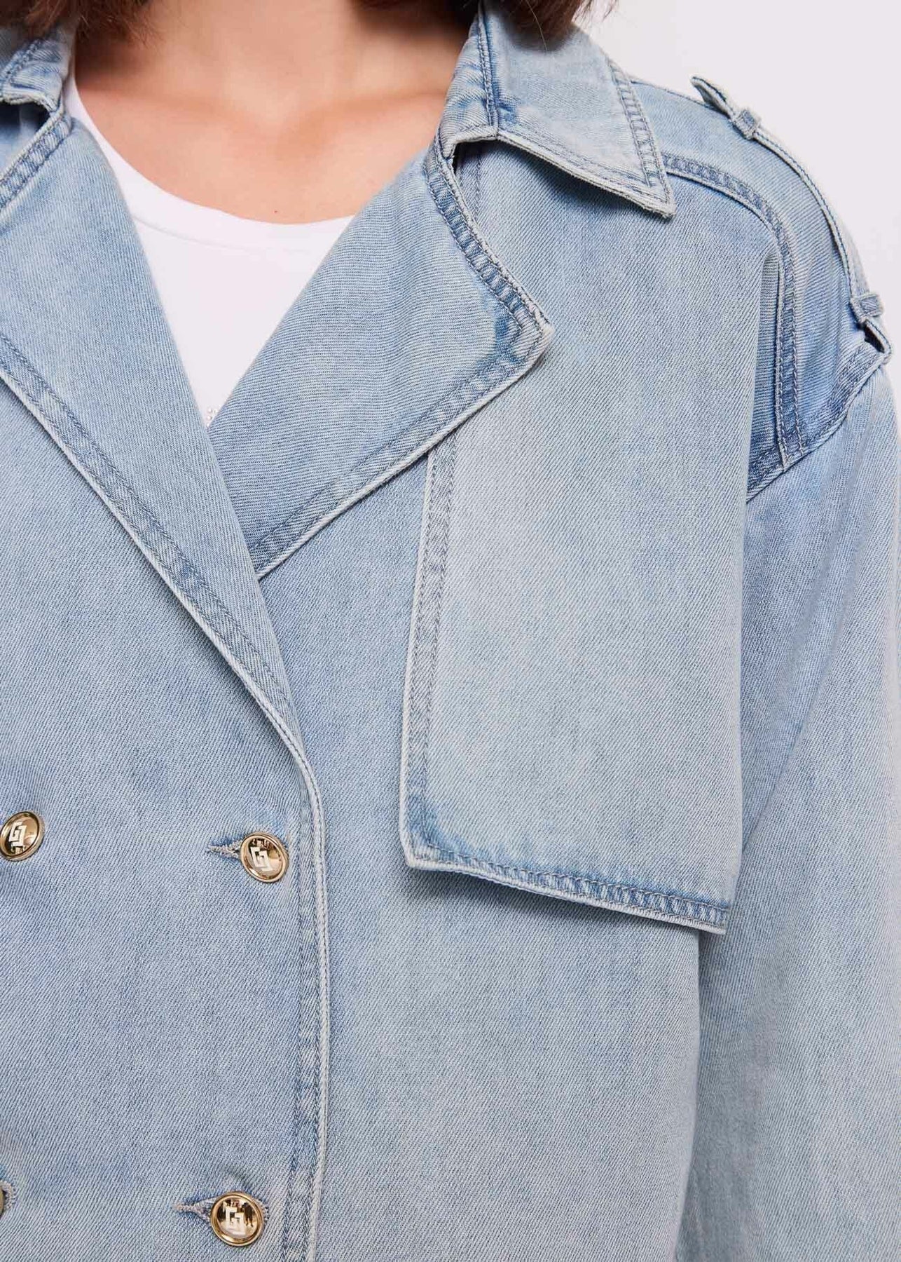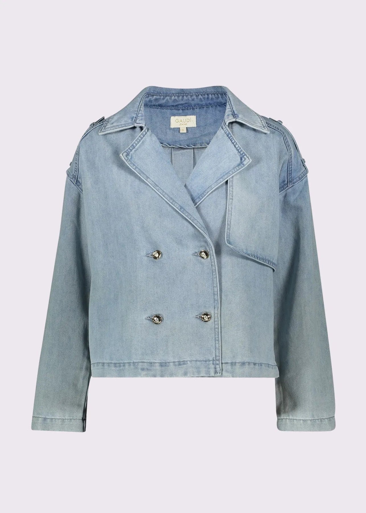 Scegli la giacca Gaudi Jeans doppiopetto in denim di cotone effetto used con collo a revers, mostrine e bottoni dorati. Per un look audace e moderno.