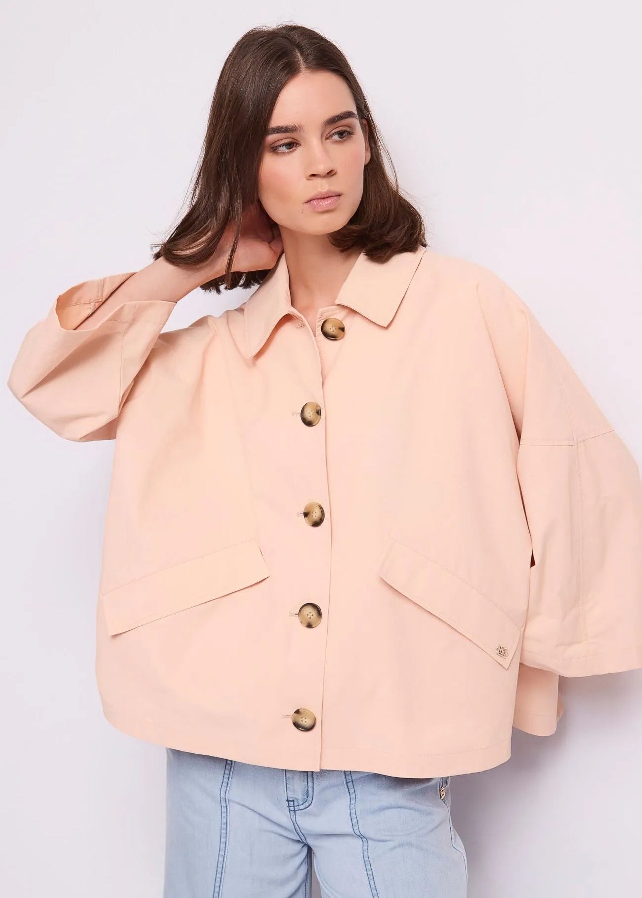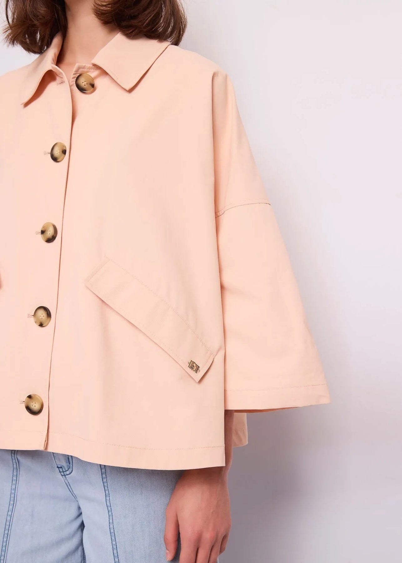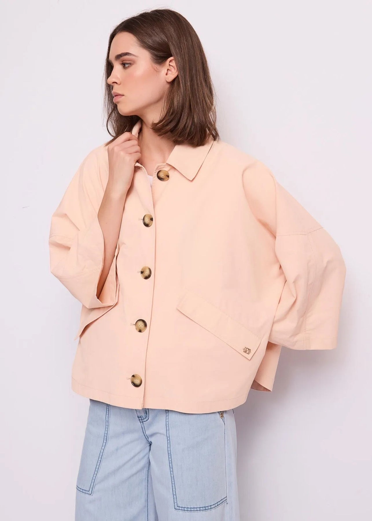 Scegli la giacca Gaudi in tessuto spalmato con collo a camicia, tasche con patta e maniche a kimono. Per un'eleganza disinvolta e moderna.