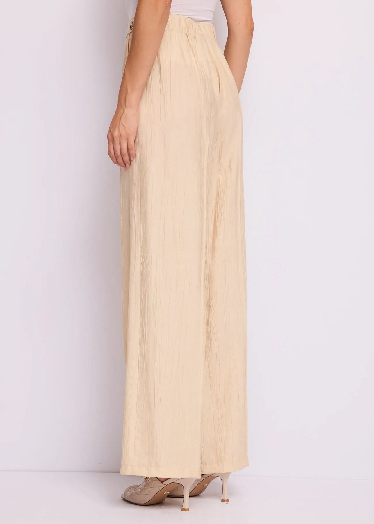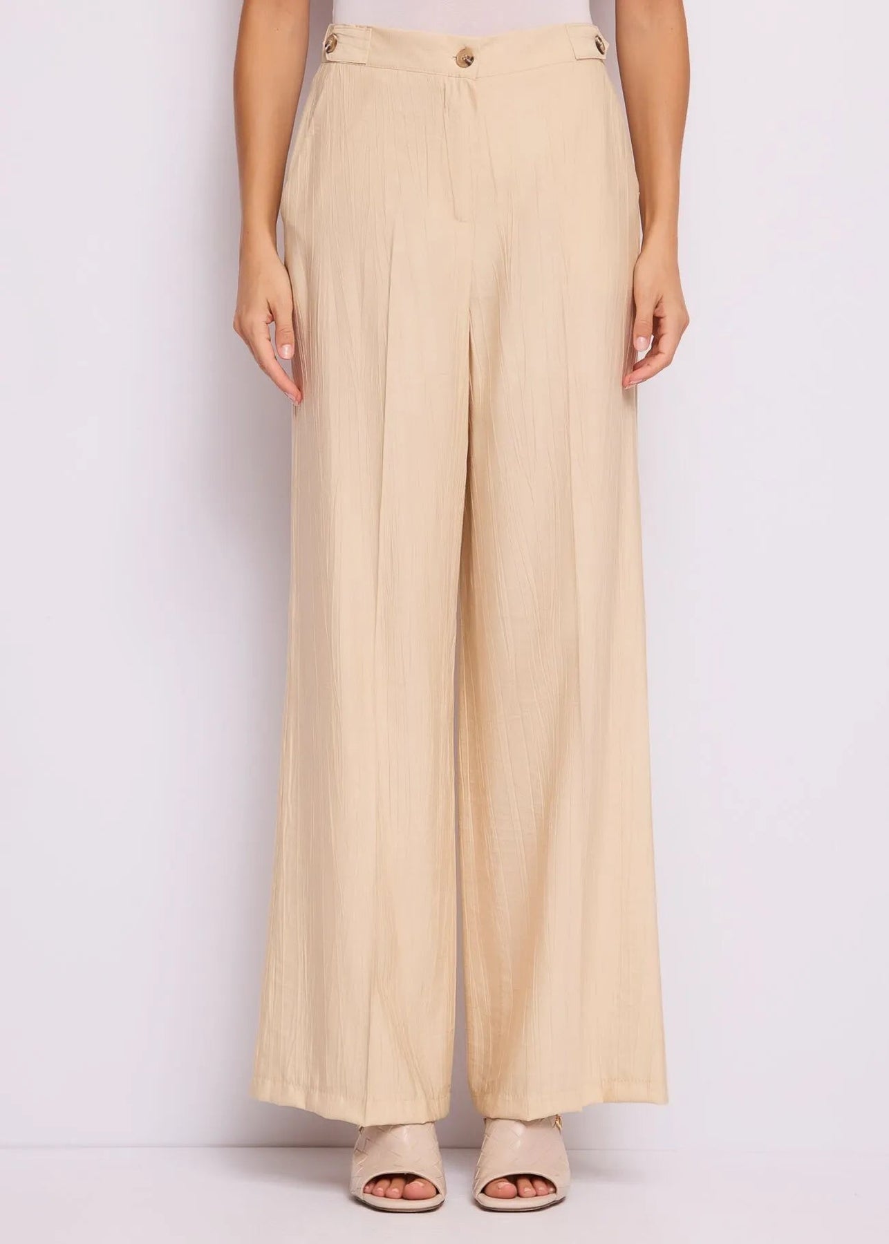 Scegli i pantaloni Gaudi in misto viscosa effetto crinkle con piega stirata, bottoni in vita e tasche sui fianchi. Linea fluida per un'eleganza spensierata.